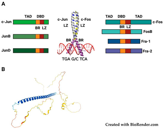(A) The JUN/FOS AP-1 complex (modified from [4]): Left: the JUN proteins (c-Jun, JunB, JunD), which form both homodimers with other JUN-family members and heterodimers with FOS proteins. Right: the FOS-family members (c-Fos, FosB, Fra-1, Fra-2), which can only heterodimerize with JUN proteins. BR: Basic Region. LZ: Leucine Zipper. TAD: Trans-Activation Domain. Middle: the crystal structure of c-Fos/c-Jun DNA-bound bZIP domain (PDB: 1FOS). The X-shaped alpha-helical structure contains the LZ (gray) and the BR (purple), directly interacting with the DNA (red). LZ leucines (blue) and other hydrophobic residues (yellow) are indicated and the canonical heptameric TRE (TPA-Response Element) sequence is reported (5′-TGA G/C TCA-3′). (B) 3D structure of human Fra-1. The model is based on the AlphaFold prediction method (available at the AlphaFold Protein Structure Database, https://alphafold.ebi.ac.uk/entry/P15407, accessed on 1 July 2021). The N-terminus of the protein is on the upper left. The colors represent the per-residue model confidence score. Blue: very high. Light blue: confident. Yellow: low. Orange: very low. The blue-colored predicted alpha-helix (from Ser101 to Pro175) encompasses the bZIP DNA-binding domain, while the other regions are likely unstructured, in absence of binding to Fra-1 interaction partners.