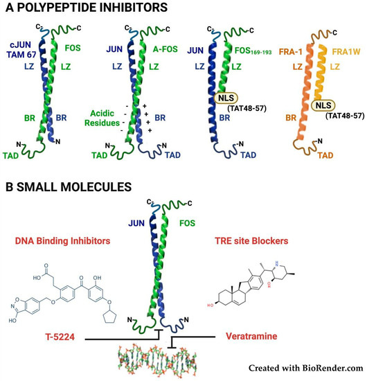 Both polypeptides and small molecule inhibitors have been exploited for interfering with AP-1 activity by several strategies.