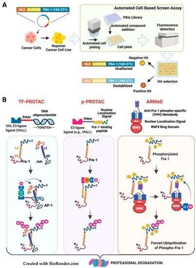 Fra-1 can be downregulated at the post-translational level, by promoting protein degradation. Several protein-kinases (ERK1/2, Rsk1, and PKC) induce the Fra-1 accumulation by inhibiting the Fra-1 C-terminal destabilizer region (Figure 2B) and the cancer-associated Fra-1 stability is phosphorylation-dependent. Remarkably, Fra-1 downregulation contributes to the therapeutic effect of the drugs targeting the MAPK pathway [21,22,24]. Therefore, the identification of protein-kinase inhibitors affecting Fra-1 half-life represents an appealing avenue. Alternatively, Fra-1 destabilization could be obtained by recently developed tools (protein degraders), aimed at the forced ubiquitylation and proteasomal degradation of target proteins.