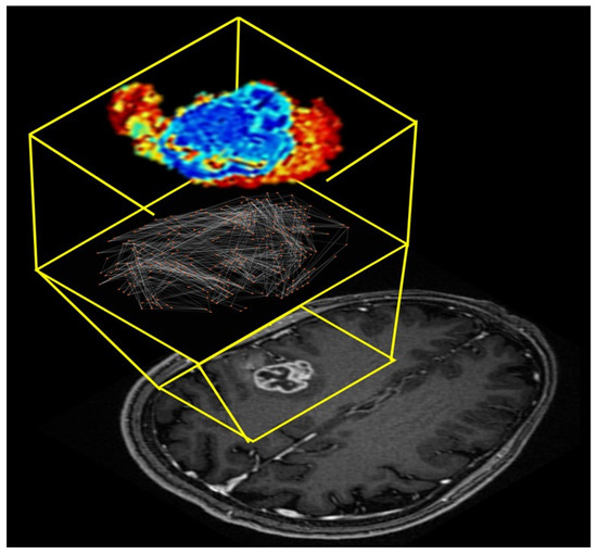 One of the current state-of-the-art methods for extraction of intra-tumoral heterogeneity from radiological images are based on radiomic texture analysis, which provides quantitative information about the intensity distribution and inter-voxel relationships within regions of interest drawn on radiological images [19,20,21,22,23] or full images [24,25]. These radiomic methods, however, do not uncover the underlying network structure of the tumor or the relationship with the lesion and surrounding tissue. In addition, visualization and interpretation of traditional texture analysis methods can be difficult and still under investigation [26]. Tumors are extremely heterogeneous and consist of many tumor microenvironments or clusters. These tumor microenvironments have sometimes been recently referred to as habitats and investigated in multiple studies [27,28,29,30,31,32,33,34,35]. However, the habitats are obtained by supervised segmentation of the tumor into a fixed set of groups, which may not reflect the true organizational structure of the tumor. Therefore, representing the tumor as a network structure will provide increased interpretability, quantification, and visualization of the different tumor substructures. By modeling the tumor as a complex network would allow for unbiased evaluation of the tumor microenvironment without assumption of a fixed classes or hard segmentation boundaries. This new approach could provide important insight into the biological organizational structure of the tumor network. Furthermore, extending the evaluation of how the complex network structure evolves over time with or without treatment could provide new metrics for planning or evaluation of treatment response in patients. In this work, we develop and extend the application of complex network analysis to the intra-tumoral network formed from integration of multiparametric (mp) radiological imaging of cancer [13]. We establish a tumor connectomics framework (TCF) for complex network analysis of tumors and surrounding tissue using mpMRI and demonstrate that the TCF performance in classification of breast, brain, and prostate lesions. Figure 1 demonstrates a typical tumor connectome from mpMRI of the brain in a patient with a WHO Grade 4 glioblastoma (malignant primary brain tumor). The anatomic T1-weighted post contrast MRI image is shown for visualization of the lesion and the intra-tumoral connections with surrounding tissue.