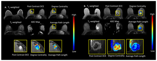 Tumor connectomics of degree centrality and average path length maps overlaid on multiparametric breast MRI. (A) An Example of a benign lesion in a 27-year-old female with focal fibroadenomatous change. The Apparent Diffusion Coefficient (ADC) Map value for this lesion was 1.54 × 10−3 mm2/s. (B) Example of an infiltrating poorly differentiated ductal carcinoma in a 56-year-old female within left breast. The ADC Map value for the lesion was 0.68 × 10−3 mm2/s.
