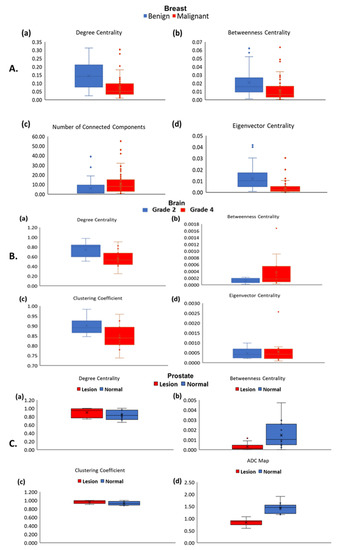 Box Plots of the tumor connectomics metrics with mean with standard error of the mean are shown in the different cancers. (A) Breast tumor connectomics are shown for benign (blue) and malignant lesions (red) for the different graph centrality and the connectivity metrics computed from the breast mpMRI of (a) degree centrality, (b) betweenness centrality, (c) clustering coefficient, and (d) eigenvector centrality. (B) Brain tumor connectomics are shown for WHO Grade 2 (blue) and Grade 4 (red) lesions for the different graph metrics computed from the tumor connectome consisting of (a) degree centrality, (b) betweenness centrality, (c) clustering coefficient, and (d) eigenvector centrality obtained from tumor connectome. (C) Prostate lesion tumor connectomics are shown normal (blue) and lesion (red) tissue within the prostate based on (a) degree centrality, (b) betweenness centrality, (c) clustering coefficient, and (d) apparent diffusion coefficient (ADC) map value obtained from tumor connectome.
