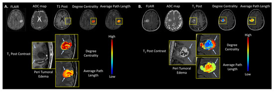 Examples of a multiparametric MRI in WHO Grade 2 and 4 brain lesions. (A) Example of a WHO Grade 2, IDH1 mutant and 1p/19q-codeleted, left perirolandic oligodendroglioma and the corresponding degree centrality and average path length maps, overlaid on T1-post contrast anatomic images. The TCF corresponding to the peripheral region of this FLAIR-hyperintense infiltrative tumor that demonstrates less prominent T1 hypointensity than the central core portion of the tumor is shown by the light blue arrows. Notice the more homogeneous appearance of the TCF in this low-grade tumor compared to that of the high-grade tumor shown on the right. (B) Example of a WHO Grade 4 IDH1 wild type and MGMT unmethylated right perirolandic glioblastoma. The maps of tumor connectomics metrics degree centrality and average path length are overlaid on the T1-post contrast anatomic images displaying the tumor. The nonenhancing T2 FLAIR-hyperintense region, which reflects peritumoral edema and microscopic tumor infiltration, is shown by the light blue arrows.