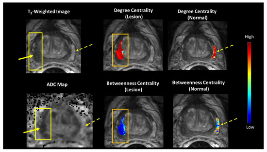 (Left) A representative patient with a Gleason 7 prostate lesion and corresponding mpMRI. (Middle and Right) The tumor connectomics framework (TCF) demonstrating the betweenness and degree centrality maps overlaid on normal (dotted yellow arrow) and lesion (solid yellow arrow) tissue corresponding with the T2-weighted image and Apparent Diffusion Coefficient (ADC) map.