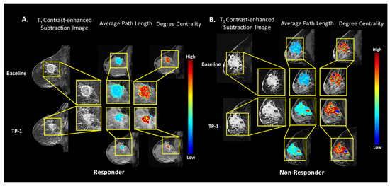 Examples of the breast MRI validation dataset in a responder and nonresponder patients after NACT. (A) Breast MRI in a typical responder patient that received NACT. The patient’s lesion decreased in size after NACT treatment. Shown are the overlays of the TCF metrics of degree centrality and average path length maps with decreases in the degree centrality and average path lengths. (B) Breast MRI in a nonresponder patient that received NACT with an increase in the patient’s lesion size after NACT. Shown are the overlays of the TCF metrics of degree centrality and average path length maps with increases in the degree centrality and average path lengths.