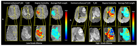 Examples of the brain MRI from the BRATS validation data set. (A) A right insular and superior temporal lobe low grade oligodendroglioma (yellow arrows) and the corresponding degree centrality and average path length maps overlaid on postcontrast T1 -weighted anatomic images. (B) A WHO Grade 4 left frontal lobe glioblastoma with the TCF maps of the metrics degree centrality and average path length overlaid on the postcontrast T1-weighted anatomic images displaying the tumor. The nonenhancing T2 -hyperintense peritumoral edema is shown by the dotted white arrows in the Grade 4 lesion.