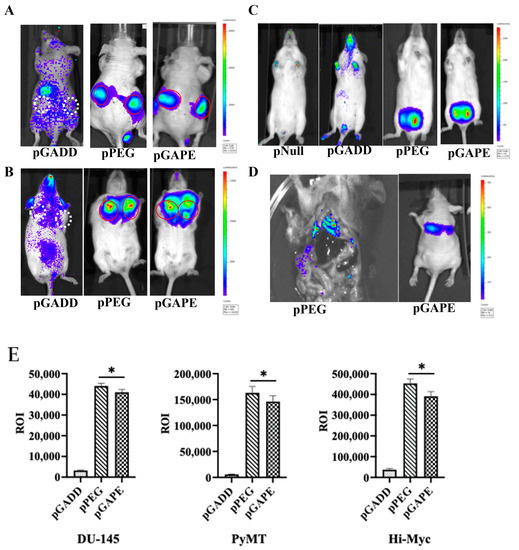 Tumor specificity of pGAPE. (A) DU-145 tumor xenografts in male athymic nude mice (n = 5) were intravenously injected with a Luc expression construct pGADD-Luc-PEI polyplex, pPEG-Luc-PEI polyplex or pGAPE-Luc-PEI polyplex, and BLI was performed after 48 h by IVIS. pGADD tumors negative for imaging are shown with white broken circles, and pPEG and pGAPE tumors positive for imaging are shown with solid red circles. (B) Tumor-bearing transgenic PyMT (n = 5) mice were treated as above, and BLI was performed after 48 h by IVIS. pGADD tumors negative for imaging are shown with white broken circles, and pPEG and pGAPE tumors positive for imaging are shown with solid red circles. (C) Tumor-bearing transgenic Hi-Myc mice (n = 5) were treated as above, and BLI was performed after 48 h by IVIS. We used control vector without the luciferase gene in the pNull group. (D) 4T1 breast cancer cells were intravenously injected into immune-competent mice (Left panel), and PC3-ML cells were intravenously injected into nude mice (right panel) followed by intravenous injection of pPEG-Luc-PEI polyplex or pGAPE-Luc-PEI polyplex, respectively. BLI was performed after 48 h by IVIS. (E) ROI determination for different tumor models. (Left panel) Total ROI calculated from DU-145 tumor-bearing mice (from A) and represented in graphical manner. (Center panel) Total ROI is calculated from PyMT (from B) and represented in graphical manner. (right) Total ROI is calculated from Hi-Myc mice and represented in graphical manner. *, p < 0.01 vs. pGADD.