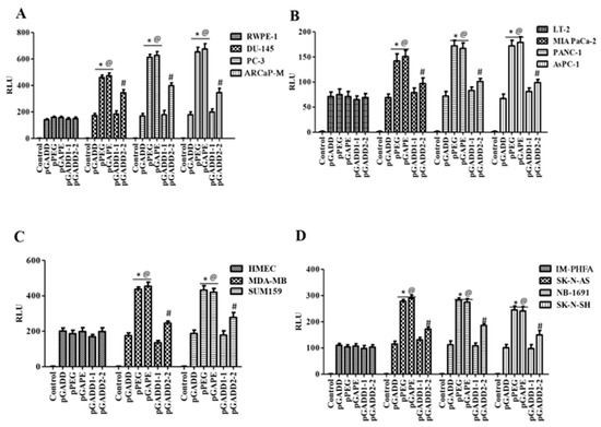 A single C-T mutation in the pGADD results in cancer specificity, which is less active than pGADD with two mutations. (A) Immortalized human prostate epithelial (RWPE-1) and prostate cancer (DU-145, PC-3 and ARCaP-M) cells. (B) Human immortalized pancreatic mesenchymal (LT-2) and pancreatic cancer (MIA PaCa-2, AsPC-1 and PANC-1) cells. (C) Primary human mammary epithelial (HMEC) and breast cancer (MDA-MB-231 and SUM159) cells. (D) Immortalized primary human fetal astrocytes (IM-PHFA) and neuroblastoma (SK-N-AS, NB-1691 and SK-N-SH) cells were transfected with PGL4-Luc (control), pGADD, pPEG, pGAPE, pGADD1-1 or pGADD2-2 for 48 h. Expression was normalized using pRL-TK, and the luminescence readings were plotted as relative luminescence units (RLU). The results presented are from three independent experiments with three replicates per experimental condition. *, p < 0.01 vs. pGADD (FDR corrected) within the individual cell lines; #, p < 0.05 vs. pGADD (FDR corrected) within the individual cell line; @, p < 0.01 vs. pPEG/pGAPE (FDR corrected) in a normal primary or immortalized normal cell line.