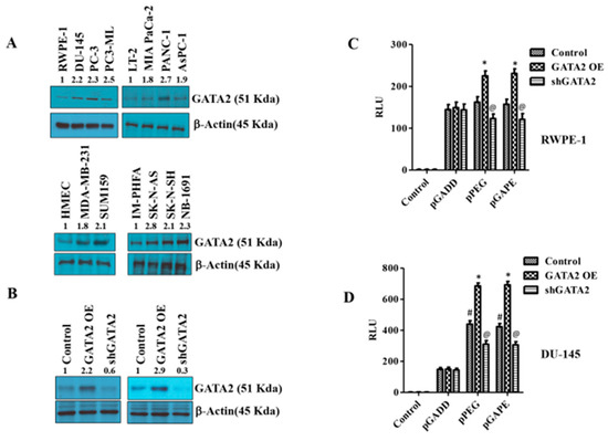 Changes in GATA2 expression affect cancer specificity. (A) Western blotting analysis for GATA2 expression levels in different cancer cells (prostate, pancreas, breast and neuroblastoma) compared with immortalized or primary normal cells. (B) RWPE-1/DU-145 cells were either transfected with a GATA2 overexpression (OE) plasmid or with an shGATA2 (small hairpin inhibitory RNA) plasmid, then were cultured for 48 h, and cells were collected, lysed and used for Western blotting. Blots were stained for GATA2, or β-Actin as a loading control. (C) RWPE-1 and (D) DU-145 cells were either transfected with a GATA2 OE plasmid or with a shGATA2 plasmid, cultured for 48 h and transfected with PGL4-Luc (control), pGADD, pPEG or pGAPE for an additional 48 h. Expression was normalized using pRL-TK, and the luminescence readings were plotted as relative luminescence units (RLU). The results presented are from three independent experiments. #, p < 0.01 vs. pGADD; *, p < 0.01 vs. pGADD-GATA2 OE; @, p < 0.05 vs. pPEG/pGAPE control (FDR corrected).