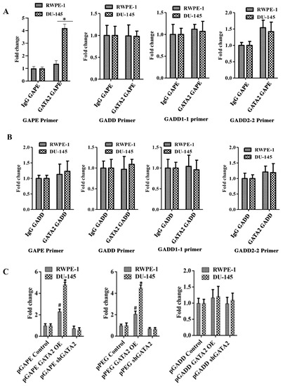 Chromatin immunoprecipitation (ChIP) assays confirmed an interaction between GATA2 and pGAPE in DU-145 and RWPE-1 cells (Figure 5A). DU-145 or RWPE-1 cells were transfected with either pGAPE or pGADD for 48 h, DNA was isolated after crosslinking, and chromatin fragmentation was performed using sonication. The fragmented chromatin were immunoprecipitated (pull down assay) with either nonspecific IgG or GATA2 antibody, and promoter binding to bound samples was monitored by PCR using pGAPE-, pGADD-, pGADD1-1-, or pGADD2-2-specific primers. Increased binding of GATA2 to pGAPE in DU-145 cells as compared to RWPE-1 cells was evident in comparison with pGADD or pGADD1-1 (Figure 5A,B). When pulled down with GATA2 and probed with pGAPE primers, pGAPE binding increased ~4-fold in DU-145 and ~1.5-fold in RWPE-1, whereas this binding was not altered with pGADD or pGADD1-1. pGADD2-2 primers showed a ~1.8-fold increased binding in both DU-145 and RWPE-1 (Figure 5A). GATA2 binding to the pGADD in DU-145 and RWPE-1 was similar when different primers were used (pGAPE, pGADD, pGADD1-1 or pGADD2-2) (Figure 5B). In total, these results confirm that GATA2 binding to pGAPE is higher in cancer cells.