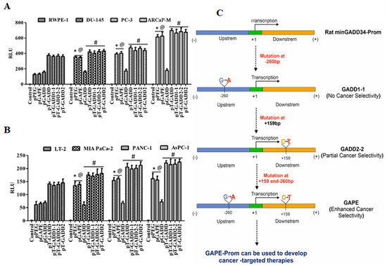 Promoter analysis of full length GADD34-Prom (pT-GADD) with single or double mutations in different cancer cells. (A) Immortalized human prostate epithelial (RWPE-1) and prostate cancer (DU-145, PC-3 and ARCaP-M) cells. *, p < 0.01 vs. RWPE-pGADD (FDR corrected); @, p < 0.01 vs. RWPE-pGADD (FDR corrected); #, not significant compared to PEG/GAPE between the cell lines. (B) Human immortalized pancreatic mesenchymal (LT-2) and pancreatic cancer (MIA PaCa-2, AsPC-1 and PANC-1) cells were transfected with PGL4-Luc (Control), pGADD34, pPEG, pGAPE, pT-GADD, pT-GADD1-1, pT-GADD2-2, or pT-GADD-2. Expression was normalized using pRL-TK, and the luminescence readings were plotted as relative luminescence units (RLU). The results presented are from three independent experiments. *, p < 0.01 vs. RWPE-pGADD (FDR corrected); @, p < 0.01 vs. RWPE-pGADD (FDR corrected); #, not significant compared to PEG/GAPE between the cell lines. (C) Flow chart showing the effect of different mutations in the pGADD and resultant properties. pGADD1-1 single mutation (bp −260, G-A), pGADD2-2 single mutation (bp +159, C-T) and pGAPE double mutants (bp −260 and bp +159). pGADD2-2 shows partial cancer selectivity, while pGAPE shows enhanced cancer selectivity. pGAPE can be used to generate transgene-expressing constructs that express uniquely at elevated levels in cancer cells, with minimal expression in normal cells.