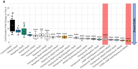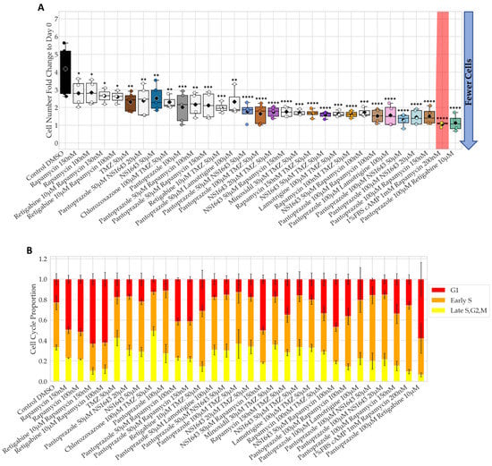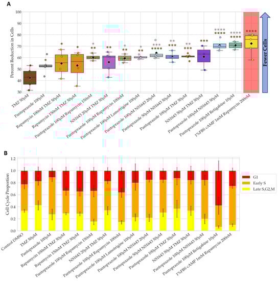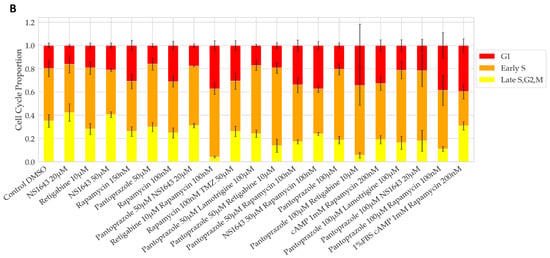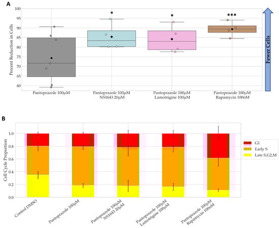 The combination of pantoprazole with lamotrigine at 100 µM, NS1643 at 20 µM, and rapamycin at 100 nM were the only combinations that showed significantly more efficacy than pantoprazole alone at reducing cell proliferation after 6 days of treatment, with the combination with rapamycin showing the most significant difference (Figure 2A). The reductions in cell number for these combinations compared to control were 85%, 86%, and 90%, respectively. The proportion of cells in G1 and early S only slightly increased for pantoprazole treatments in combination with lamotrigine and NS1643, but the combination with rapamycin did increase the G1 proportion (Figure 2B). Taken together, these data reveal that several FDA approved drugs for human use can be repurposed in combination and can significantly reduce cancer cell proliferation.