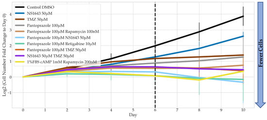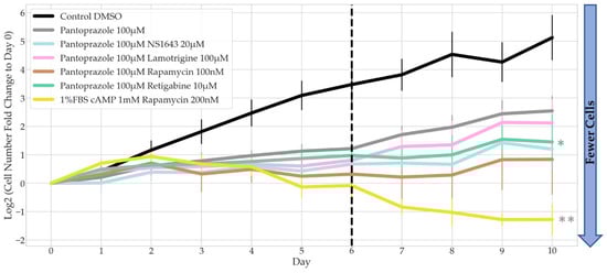 Recovery Test of Bioelectric Treatments in Combination with Pantoprazole in NG108-15 FUCCI Cells. The log2 of the fold change in cell counts to Day 0 were recorded for 10 days. Dotted line marks the day on which drug treatment was removed and replaced with control media (n > 3 biological replicates). Combination drug treatment slopes from Day 6 to Day 10 were compared to pantoprazole alone, significance is shown with grey stars next to the corresponding line **: p < 0.01, *: p < 0.05 (one-way ANOVA with Dunnett post hoc analysis n > 3 biological replicates).