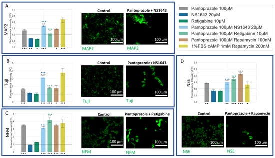 We next wanted to ask whether, in addition to the effects on proliferation, our treatments also exerted a differentiating influence, which could be beneficial with respect to the future behavior of treated cells in vivo. Differentiation markers for neuronal lineage were used to stain NG108-15 cells incubated for six days with the most effective treatments observed in the proliferation data (Figure 8). We found that treatment with pantoprazole at 100 µM combined with NS1643 at 50 µM or with rapamycin at 100 nM consistently showed a significant increase in neuronal differentiation markers, including Microtubule Associated Protein 2 (MAP2) [], Neuron-Specific Class III β-Tubulin (TujI) [], Neuron-Specific Enolase (NSE) [], and Neural Filament Medium Chain (NFM) []. The combination of pantoprazole with retigabine at 10 µM showed increases in all but MAP2. Combinations of pantoprazole with either NS1643 or retigabine showed a significant increase in neuronal markers compared to either drug alone. The combination of NS1643 with pantoprazole showed higher levels of both MAP2 and Tuj1, than for pantoprazole alone. Retigabine in combination with pantoprazole showed higher immunoreactivity of NFM as compared to pantoprazole alone. These observations suggest that these treatments are pushing the treated cells toward a more differentiated state.
