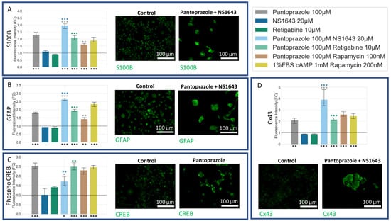 Staining cells treated for 6 days with S100 calcium-binding protein B (S100B) [] and Glial Fibrillary Acidic Protein (GFAP) [] markers revealed differentiation of NG108-15 cells towards an astrocytic/oligodendrocytic or astrocytic lineage, respectively (Figure 9A,B). Both markers were significantly upregulated in all combination treatment groups as well as in pantoprazole alone. The combination of NS1643 with pantoprazole showed significantly higher S100B and GFAP immunoreactivity than with pantoprazole alone. All treatments but NS1643 alone showed a significant increase in CREB, known to play an important role in driving differentiation [,,,,] (Figure 9C). Pantoprazole alone, along with its combinations, also showed an increase in connexin 43 (Cx43) expression, a known marker for glioblastoma differentiation [].