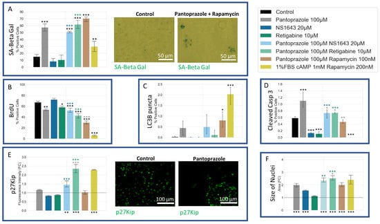Senescence and Proliferation Analysis of NG108-15 Cells Reveals that Treatments with Pantoprazole Increased Senescence, Decreased BrdU Incorporation, and Increased a p27Kip1 after 6 days. A senescence associated beta-galactosidase stain was conducted and scored by eye. Immunofluorescence of cells was conducted and analyzed with CellProfiler for integrated fluorescence intensity or presence or absence of a cellular signal. (A) Stain of senescence associated beta-galactosidase stain (SA-Beta Gal). (B) Stain of bromodeoxyuridine incorporation (BrdU). (C) Stain of the microtubule-associated protein light chain 3 B (LC3B). (D) Stain of cleaved caspase 3 (Casp 3). (E) Stain of cyclin-dependent kinase inhibitor 1B (p27Kip). (F) Size of Nuclei, determined by area of the Hoechst stain. Treatments corresponding to the colored bars are outlined in the figure itself. The log of the fold change in intensity was compared between single treatments and combined treatments, except the positive control, with significant values shown in the color of the treatment compared. The initial fluorescence intensities were compared to their corresponding control, with significant values shown under the bars. The logit of the percent positive cells was compared between single treatments and control, in cases of 0 values, the arcsine transformation was used. Significance was expressed as, ***: p < 0.001, **: p < 0.01, *: p < 0.05 (one-way ANOVA with Tukey post hoc analysis n > 3 technical replicates).