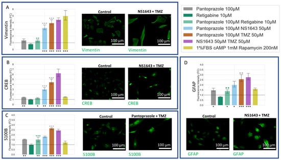 Astrocytic differentiation markers were increased in treatments with pantoprazole and pantoprazole in combination with NS1643, retigabine, rapamycin, and TMZ, as well as NS1643 in combination with TMZ (Figure 12). Vimentin, a known marker for astrocytes [,], was significantly increased when cells were treated with pantoprazole in combination with NS1643, TMZ, and rapamycin and with NS1643 in combination with TMZ (Figure 12A). CREB (Figure 12B), a known marker for differentiation and S100B (Figure 12C) and GFAP (Figure 12D), markers for astrocytic differentiation, also were increased by these same treatments (Figure 12B). These results agreed well with what was found in NG108-15 cells.