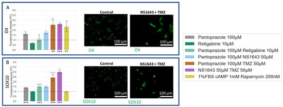 Differentiation Analysis of U87 Cells Reveals that Treatments with Pantoprazole Increased Oligodendrocyte Markers after 6 days. Immunofluorescence of cells was conducted and analyzed with CellProfiler for integrated fluorescence intensity. (A) Stain of oligodendrocyte marker O4. (B) Stain of the Sry-related HMg-Box gene 10 (SOX10). Treatments corresponding to the colored bars are outlined in the figure itself. The log of the fold change in intensity was compared between single treatments and combined treatments, except the positive control, with significant values shown in the color of the treatment compared. The initial fluorescence intensities were compared to their corresponding control, with significant values shown under the bars as, ***: p < 0.001, **: p < 0.01, *: p < 0.05 (one-way ANOVA with Tukey post hoc analysis n > 3 technical replicates).