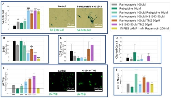 We also sought to determine whether our treatments may induce senescence, as this would be an important outcome with respect to the course of the malignancy in vivo. Treatments of NG108-15 cells with pantoprazole alone or in combination with NS1643, retigabine, and rapamycin all showed a very significant increase in a senescence-associated beta-galactosidase activity stain [] (Figure 10A). To explain this increase, we also looked at the p27Kip1 level, which is known to inhibit the cell cycle and cause senescence [,,,,,,,] (Figure 10E). Immunoreactivity levels of p27Kip1 in all combined treatments except for pantoprazole with rapamycin were elevated. To confirm the senescence phenotype, we also looked at the size of the nuclei, which were significantly larger in the pantoprazole, NS1643, and pantoprazole in combination with NS1643, retigabine, or rapamycin-treated groups (Figure 10F). We also tested the cells for cleaved caspase 3 (Figure 10D), a marker of apoptosis and LC3B (Figure 10C), a marker of autophagy. We found that levels for both these markers were under 1.4% and 2.5%, respectively, after 6 days of treatment which may indicate a small percentage of cells that did not senesce due to the highly heterogeneous nature of these cancer cells. Although low, there was a significant increase in cleaved caspase 3 staining for cells treated with pantoprazole or pantoprazole with NS1643, retigabine, or rapamycin. Surprisingly, we observed that treatment with retigabine or NS1643 decreased the cleaved caspase 3 positive cells significantly as compared to the control. In addition, the LC3B stain showed an increase in cells treated with pantoprazole and pantoprazole with NS1643, although not significant with this assay. However, there was a significant increase in bright LC3B puncta in cells that were treated with any combination containing rapamycin, as was expected (Figure 10C). Proliferation in NG108-15 cells as measured by BrdU incorporation showed a significant decrease with treatments of pantoprazole alone, retigabine alone, and combinations of pantoprazole with NS1643, retigabine, and rapamycin after 6 days (Figure 10B), agreeing with the live cell counts obtained in Figure 1A. Thus, we conclude that the combinatorial treatments that resulted in the lowest cellular proliferation also showed increased markers for senescence, some increase in autophagy, and did not show a large fraction of apoptotic cells.