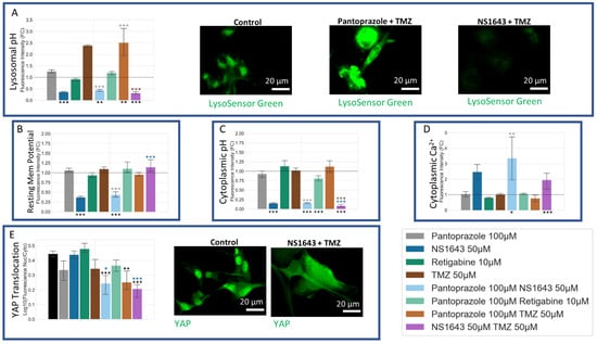 Voltage Dyes Showed that U87 Cells Treated with NS1643 and a Combination of NS1643 and Pantoprazole for 6 Days Showed a Hyperpolarization and YAP Increases its Translocation to the Cytoplasm in NS1643 or Pantoprazole with TMZ, and Pantoprazole with NS1643 Treatment. Immunofluorescence of cells was conducted and analyzed with CellProfiler for integrated fluorescence intensity. Dye assays were analyzed for mean intensity, except for LysoSensor Green which was analyzed for integrated intensity. (A) Stain of lysosomal pH with LysoSensor Green, low levels indicate alkalization. (B) Dye indicator of membrane voltage, DiBAC4(3), low levels indicate hyperpolarization. (C) Dye indicator of cytoplasmic pH, pHRodo Green, low levels indicate alkalization. (D) Dye indicator of cytoplasmic calcium, Fluo-4AM, high levels indicate an increase in calcium. (E) The ratio of nuclear to cytoplasmic Yes-associated protein (YAP), lower levels indicate translocation to the cytoplasm. Treatments corresponding to the colored bars are outlined in the figure itself. The log of the fold change in intensity was compared between single treatments and combined treatments, except the positive control, with significant values shown in the color of the treatment compared. The initial fluorescence intensities were compared to their corresponding control, with significant values shown under the bars as, ***: p < 0.001, **: p < 0.01, *: p < 0.05 (one-way ANOVA with Tukey post hoc analysis n > 3 technical replicates).