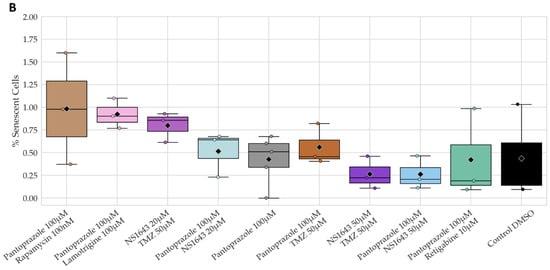 3.11. U87 Cells Also Show an Increase in p27Kip1 and Senescence Markers When Treated with Pantoprazole Alone or in Combination with Hyperpolarizing Compounds