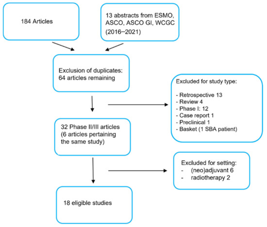 After the first round of search, we identified 197 articles matching the chosen keyword combinations. The list of articles consisted of 184 publications and 13 abstracts from the most recent congresses in the fields of oncology and gastro-intestinal oncology (ASCO, ESMO, ASCO GI and WCGC by ESMO). We selected a core of 64 articles after excluding duplicates (Figure 1). Subsequently, we eliminated the articles that did not match the inclusion and exclusion criteria set at the time of the search-protocol development and, whenever more than one article pertained the same study, we chose the most recent report. Following in-depth evaluation of the abstracts, 13 studies turned out to be retrospective, 4 studies fell within the review article category, 12 studies were phase I trials, 1 study was a case report, 1 study was a preclinical report and 1 study was a basket trial with only one patient affected by a small bowel adenocarcinoma. Of the remaining 32 articles, 6 pertained studies for which a more recent publication was available. Among a total of 26 phase II/III clinical trials, 6 studies were excluded, as they were carried out in the neo/adjuvant setting, and 2 studies were not considered, being radiotherapy trials. A total of 18 studies turned out to be fully eligible; they were tabulated in an Excel file and analyzed for their efficacy endpoints (Table 1).