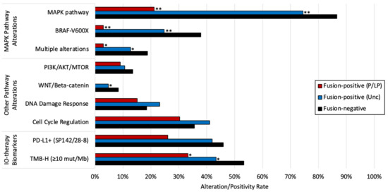 Prevalence of key pathway alterations and therapy-associated biomarkers in fusion-positive and fusion-negative tumors. * p < 0.05, ** Q < 0.05 (Benjamini–Hochberg). p-values reflect the comparison with the fusion-negative cohort.