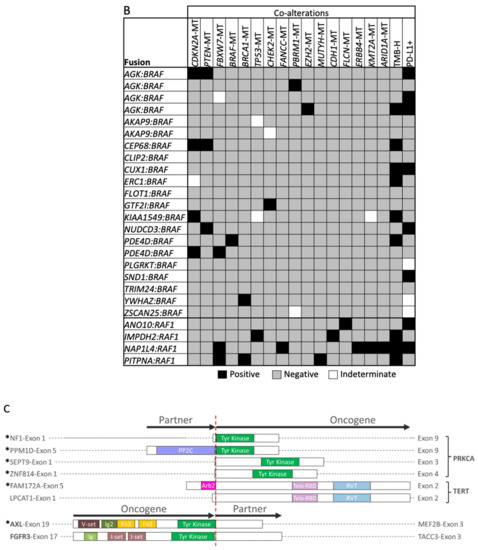 To better understand the functional consequences of presumed oncogenic gene fusion events, we first determined which functional domains were retained from each fusion partner. Of the 33 oncogenic fusion-positive samples identified, oncogene fusion partners included BRAF (n = 21), RAF1 (n = 4), PRKCA (n = 4), TERT (n = 2), AXL (n = 1), and FGFR3 (n = 1), 14 of which have not been previously reported (Figure 2). A variety of genes with different functional domains were fused with BRAF, while a recurrent fusion with AGK (n = 4) had no known functional domains contributed by the short AGK sequence fused with BRAF (Figure 2A,C). No recurrent fusion partners were observed for RAS1 or other oncogenes, most of which were novel fusions. With the exception of TERT fusions, all presumed oncogenic fusions retained the tyrosine kinase domain from the oncogene partner.