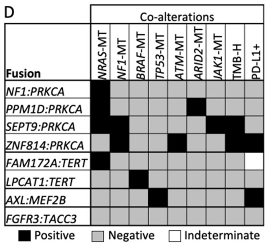 TMB-H and PD-L1+ expression were each observed in six BRAF fusion-positive tumors, yet concurrently in only two tumors (Figure 2B,D). TMB-H was also observed in RAF1 fusion-positive melanomas (n = 3), with pathogenic mutations identified in two or more genes per tumor. NRAS (n = 3) and NF1 co-mutations (n = 2) were identified in PRKCA fusion-positive tumors, and one tumor harbored a PRKCA fusion with NF1. Tumors with TERT fusions had co-mutations in BRAF (n = 1) or NRAS (n = 1). While no co-alterations were identified in an FGFR3 fusion-positive tumor, an AXL fusion-positive tumor was TP53-mutated and PD-L1+. Notably, BRAF and RAF1 fusion-positive tumors lacked concurrent MAPK pathway alterations.