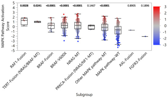 MAPK pathway activation. MAPK pathway activation scores were determined by the relative expression of key gene transcripts. Patient samples were stratified into subgroups based on the detection of pathogenic/likely pathogenic fusion or MAPK pathway alteration (co-alterations noted in parentheses). p-values (Mann-Whitney U) noted above each subgroup reflect the comparison with the MAPK pathway-WT control subgroup.