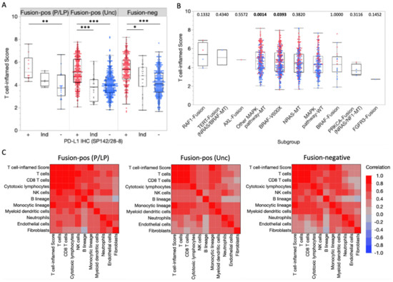 Transcriptional profiling of the tumor microenvironment. (A) T cell-inflamed scores in fusion-positive and fusion-negative tumors according to PD-L1 IHC (SP142/28-8) status (Red = positive [+], Blue = negative [–], gray = Indeterminate [Ind]). * p < 0.05, ** p < 0.01, *** p < 0.0001. (B) T cell-inflamed scores in subgroups based on detected fusions or MAPK pathway alterations (co-alterations noted in parentheses). p-values (Mann-Whitney U) noted above each subgroup reflect the comparison with the MAPK pathway-WT control subgroup. (C) Spearman correlation coefficients for T cell-inflamed scores and immune/stromal cell population abundances.