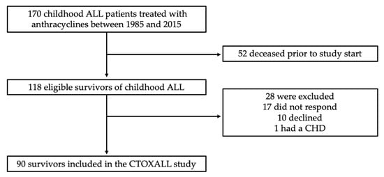 A total of 170 patients aged <18 years were diagnosed with ALL during the specified period. Among these, 52 patients died prior to the study’s start date and among the 118 eligible patients, 28 patients were not included: 17 patients did not respond to the invitation, 10 patients refused to participate, and 1 patient had a CHD (Figure 1).