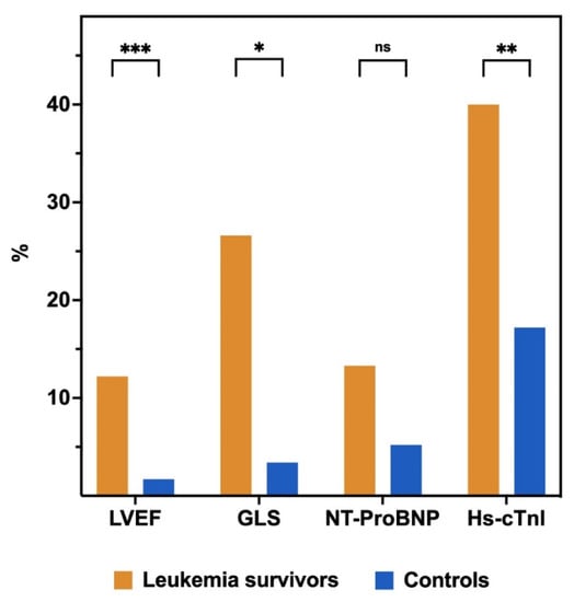 Prevalence of left ventricular systolic dysfunction and biomarkers abnormalities in leukemia survivors and controls. Cut-off values were LVEF < 50%, GLS < 18.5%, NT-ProBNP > 125 pg/mL, and Hs-cTnI > 2.5 ng/L. * p < 0.001, ** p < 0.01, *** p < 0.05. ns, Not significant.