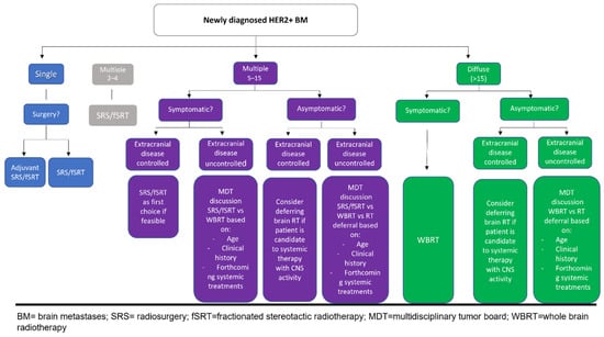 RT deferral can be a valid option for patients with diffuse asymptomatic BMs who are eligible for a systemic therapy with intracranial activity, providing close MRI follow-up evaluations are undertaken to properly treat progression. Recent guidelines recommend this approach for patients to be treated with tucatinib combination therapy [68], even though lapatinib combinations may play a role in this setting.