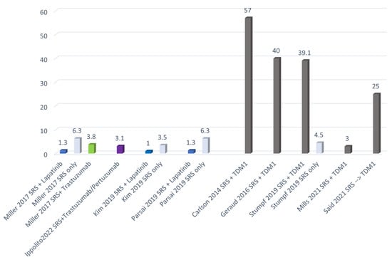 One of the first published studies described the outcome of a total of 13 breast cancer patients receiving SRS, of which 7 were also treated with T-DM1: 57% of patients treated with SRS + T-DM1 developed RN [65].