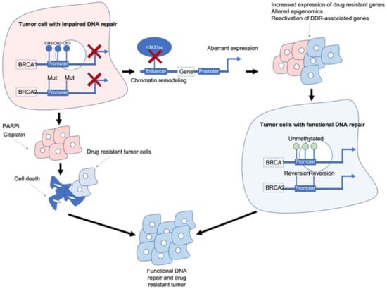 BRCA1/2 deficiency can impair the HR pathway leading to increased sensitivity to DNA-damaging agents such as platinum chemotherapy and PARPi. However, BRCA1/2 deficiency can also lead to chromatin remodelling and reduced H3K27ac at regulatory regions such as enhancers/super-enhancers, leading to the aberrant expression of genes including those associated with drug resistance/DDR-associated genes. Reactivation of BRCA1/2 and/or other DDR-associated genes can result in tumour cells which are drug resistant and have functional DNA damage repair.