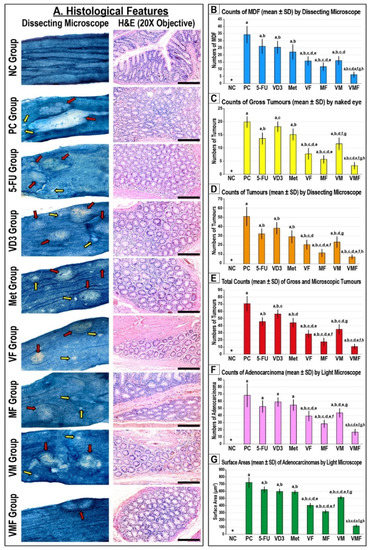 (A) Mouse colon mucosa from all the study groups under a dissecting microscope (n = 10 mice/group; ×20 magnification; red arrow = tumours; yellow arrow = mucin-depleted foci (MDF)) alongside colonic tissue sections from all groups by H&E stain (n = 10 mice/group; ×200 magnification; scale bar = 15 μm). Furthermore, the numbers of (B) MDF, (C) gross tumours, (D) microscopic tumours, (E) total tumours, and (F) adenocarcinomas alongside (G) the adenocarcinomas’ surface areas are shown as bar graphs (n = 10 mice/group; data were analysed by ANOVA followed by Games–Howell post hoc tests and are shown as the mean ± SD; * = not detected; a = p < 0.05 compared with the NC group; b = p < 0.05 compared with the PC group; c = p < 0.05 compared with 5-FU monotherapy; d = p < 0.05 compared VD3 monotherapy; e = p < 0.05 compared with Met monotherapy; f = p < 0.05 compared with VF dual therapy; g = p < 0.05 compared with MF dual therapy; and h = p < 0.05 compared with VM dual therapy). * = Not detected.
