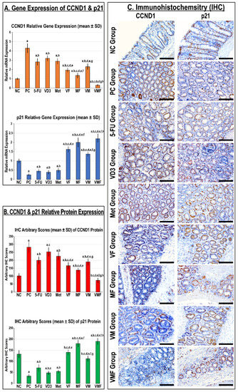 The relative (A) gene and (B) protein expression of CCND1 and p21 molecules in colonic tissues from the different groups is shown as bar graphs (n = 10 mice/group; data were analysed by ANOVA followed by Tukey’s HSD post hoc test and are shown as the mean ± SD; a = p < 0.05 compared with the NC group; b = p < 0.05 compared with the PC group; c = p < 0.05 compared with 5-FU monotherapy; d = p < 0.05 compared VD3 monotherapy; e = p < 0.05 compared with Met monotherapy; f = p < 0.05 compared with VF dual therapy; g = p < 0.05 compared with MF dual therapy; and h = p < 0.05 compared with VM dual therapy). (C) Localisation of CCND1 and p21 proteins by immunohistochemistry (IHC) in colonic tissues from the different groups (n = 10 mice/group; 20× objective; scale bar = 15 μm).