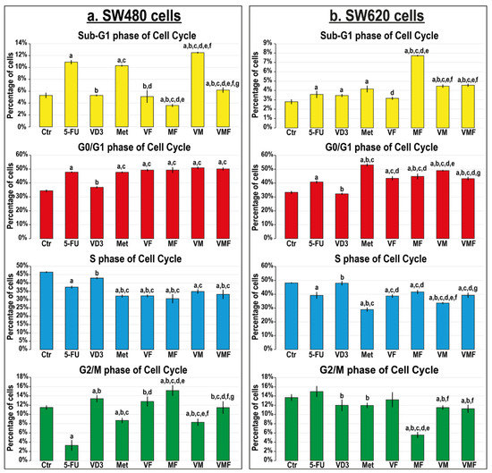 Percentages of cells (mean ± SD) in the different phases of the cell cycle in untreated control cells, and following treatments with 5-fluorouracil, calcitriol, and/or metformin single (5-FU, VD3, and Met), dual (VF, MF, and VM), and triple (VMF) therapies for 12 h in the (a) SW480 and (b) SW620 colon cancer cell lines (n = 3/group; data were analysed by ANOVA followed by Games–Howell post hoc tests and are shown as the mean ± SD; a = p < 0.05 compared with control untreated cells; b = p < 0.05 compared with 5-FU monotherapy; c = p < 0.05 compared VD3 monotherapy; d = p < 0.05 compared with Met monotherapy; e = p < 0.05 compared with VF dual therapy; f = p < 0.05 compared with MF dual therapy; and g = p < 0.05 compared with VM dual therapy).