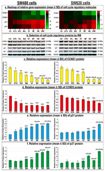 (a) Heatmap showing relative mRNA expression (mean ± SD) of CCND1, CCND3, p21, and p27 genes alongside (b) detection of their proteins by Western blot and (c–f) their relative protein expression (mean ± SD), following treatments with 5-fluorouracil, calcitriol, and/or metformin single (5-FU, VD3, and Met), dual (VF, MF, and VM), and triple (VMF) therapies for 12 h in the SW480 and SW620 colon cancer cell lines (n = 3/group; data were analysed by ANOVA followed by Games–Howell post hoc tests and are shown as the mean ± SD; a = p < 0.05 compared with control untreated cells; b = p < 0.05 compared with 5-FU monotherapy; c = p < 0.05 compared VD3 monotherapy; d = p < 0.05 compared with Met monotherapy; e = p < 0.05 compared with VF dual therapy; f = p < 0.05 compared with MF dual therapy; and g = p < 0.05 compared with VM dual therapy).