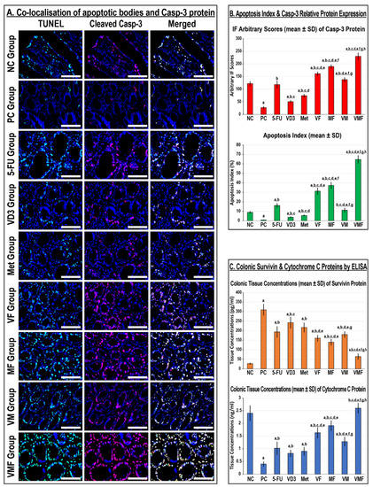 (A) Co-detection of apoptotic bodies by TUNEL (green) with cleaved Casp-3 (red) by immunofluorescence in the colonic tissues from all the study groups (n = 10 mice/group; 40× objective; scale bar = 8 µm). (B) The relative expression of the Casp-3 protein alongside the apoptosis index and (C) the colonic tissue concentrations of survivin and cytochrome C proteins from all groups are displayed as bar graphs (n = 10 mice/group; data were analysed by ANOVA followed by Tukey’s HSD test and are shown as the mean ± SD; a = p < 0.05 compared with the NC group; b = p < 0.05 compared with the PC group; c = p < 0.05 compared with 5-FU monotherapy; d = p < 0.05 compared VD3 monotherapy; e = p < 0.05 compared with Met monotherapy; f = p < 0.05 compared with VF dual therapy; g = p < 0.05 compared with MF dual therapy; and h = p < 0.05 compared with VM dual therapy).