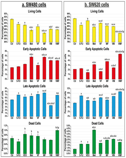 Percentages (mean ± SD) of living, early and late apoptotic, and dead cells in untreated control cells, and following treatments with 5-fluorouracil, calcitriol, and/or metformin single (5-FU, VD3, and Met), dual (VF, MF, and VM), and triple (VMF) therapies for 12 h in the (a) SW480 and (b) SW620 colon cancer cell lines (n = 3/group; data were analysed by ANOVA followed by Games–Howell post hoc tests and are shown as the mean ± SD; a = p < 0.05 compared with control untreated cells; b = p < 0.05 compared with 5-FU monotherapy; c = p < 0.05 compared VD3 monotherapy; d = p < 0.05 compared with Met monotherapy; e = p < 0.05 compared with VF dual therapy; f = p < 0.05 compared with MF dual therapy; and g = p < 0.05 compared with VM dual therapy).