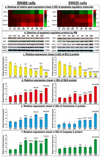 (a) Heatmap showing relative mRNA expression (mean ± SD) of BCL2, BAX, cytochrome C, and caspase-3 genes alongside (b) detection of their proteins by Western blot and (c–f) their relative protein expression (mean ± SD) following treatments with 5-fluorouracil, calcitriol, and/or metformin single (5-FU, VD3, and Met), dual (VF, MF, and VM), and triple (VMF) therapies for 12 h in the SW480 and SW620 colon cancer cell lines (n = 3/group; data were analysed by ANOVA followed by Games–Howell post hoc tests and are shown as the mean ± SD; a = p < 0.05 compared with control untreated cells; b = p < 0.05 compared with 5-FU monotherapy; c = p < 0.05 compared VD3 monotherapy; d = p < 0.05 compared with Met monotherapy; e = p < 0.05 compared with VF dual therapy; f = p < 0.05 compared with MF dual therapy; and g = p < 0.05 compared with VM dual therapy).