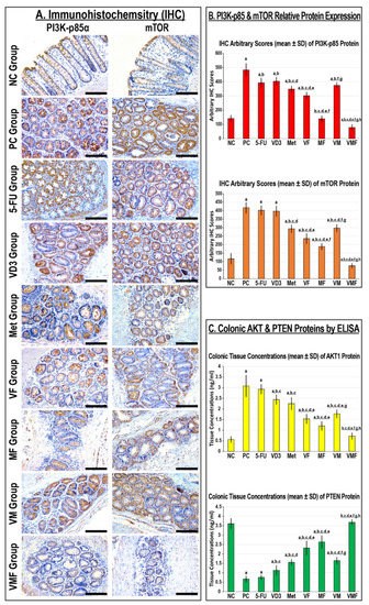 Localisation of PI3K-p85α and mTOR proteins by immunohistochemistry (IHC) in colonic tissues from the different groups (20× objective; scale bar = 15 μm). (B) The relative protein expression of PI3K-p85α and mTOR and (C) the colonic tissue concentrations of Akt1 and PTEN proteins in the different study groups are displayed as bar graphs (n = 10 mice/group; data were analysed by ANOVA followed by Tukey’s HSD post hoc test and are shown as the mean ± SD; a = p < 0.05 compared with the NC group; b = p < 0.05 compared with the PC group; c = p < 0.05 compared with 5-FU monotherapy; d = p < 0.05 compared VD3 monotherapy; e = p < 0.05 compared with Met monotherapy; f = p < 0.05 compared with VF dual therapy; g = p < 0.05 compared with MF dual therapy; and h = p < 0.05 compared with VM dual therapy).