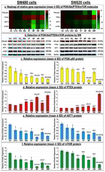 (a) Heatmap showing relative mRNA expression (mean ± SD) of PI3K-p85α, PTEN, Akt1, and mTOR genes alongside (b) detection of their proteins by Western blot and (c–f) their relative protein expression (mean ± SD) following treatments with 5-fluorouracil, calcitriol, and/or metformin single (5-FU, VD3, and Met), dual (VF, MF, and VM), and triple (VMF) therapies for 12 h in the SW480 and SW620 colon cancer cell lines (n = 3/group; data were analysed by ANOVA followed by Games–Howell post hoc tests and are shown as the mean ± SD; a = p < 0.05 compared with control untreated cells; b = p < 0.05 compared with 5-FU monotherapy; c = p < 0.05 compared VD3 monotherapy; d = p < 0.05 compared with Met monotherapy; e = p < 0.05 compared with VF dual therapy; f = p < 0.05 compared with MF dual therapy; and g = p < 0.05 compared with VM dual therapy).