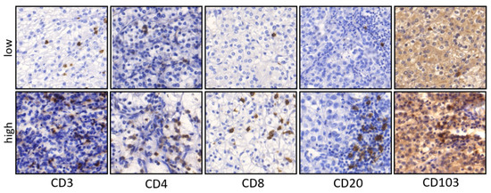 Representative pictures of IHC staining in primary ccRCC. Examples for low and high densities of CD3, CD4, CD8, CD20 and CD103 positive cells in primary ccRCC (×200 magnification).