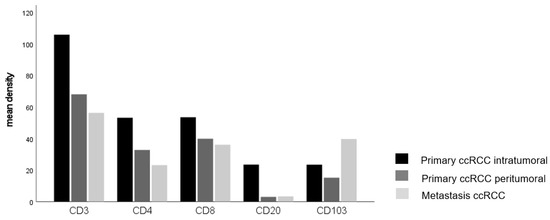 There are few investigations into CD103+ lymphocytes in ccRCC. However, CD103+ lymphocytes infiltrating distant metastases in ccRCC have not been characterized yet. Comparing the composition of the immune infiltrate in primary tumors and paired distant metastases, we found a significant accumulation of CD103+ lymphocytes in lung metastases but not in other metastatic sites. A comparison of the immune cell infiltrates of lung metastases with those in other metastatic sites, such as bone or adrenal glands, revealed a significantly higher numbers of CD3+, CD4+ and CD103+ cells. This suggests that the lung is a metastatic site in ccRCC with high frequencies of immune cell–tumor cell interactions. Regarding lung metastases, different results were described for colorectal carcinoma and hepatocellular carcinoma, in which CD3+ and CD8+ cells did not accumulate in lung metastases compared to primary tumors [30,31].