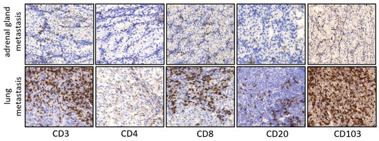 Representative pictures of IHC staining in primary ccRCC in metastatic lesions. Examples CD3, CD4, CD8, CD20 and CD103 infiltration in adrenal gland metastasis and lung metastasis (×100 magnification).