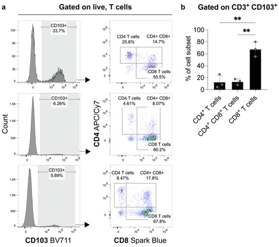 FACS analysis from fresh tumor material of three patients with ccRCC. The proportions of CD4+- and CD8+-expressing cells amongst CD103+ T-lymphocytes. (a) Flow cytometry plots show the frequency of CD103 expression on live, T-cells (gated on Zombie NIR- CD3+) and the subsequent distribution of CD4+ and CD8+ expressing cells amongst these CD103+ T-lymphocytes. The proportions of CD4+, CD4+ CD8+ and CD8+ cells as a frequency of CD3+ CD103+ cells are graphed in (b). N = 3 biological replicates. Error bars represent means ± standard deviation (SD) with each point representing one biological replicate. Statistical significance was determined using a one-way analysis of variance (ANOVA) with Tukey’s multiple comparisons test (** p-value < 0.01).