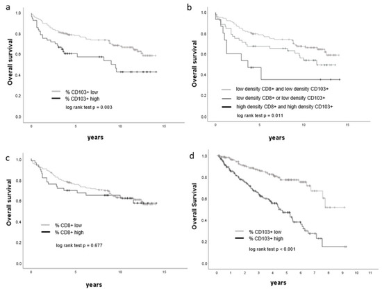 In recent years, CD103 (integrin αE) has been described as a surface marker of tissue-resident memory cells. Whilst the role of tissue-resident memory cells is poorly understood, the accumulation of CD103+ lymphocytes has been associated with good prognosis in several cancer subtypes, including urothelial carcinoma and ovarian cancer [33,34]. In lung cancer, the accumulation of CD103+ lymphocytes was reportedly associated with survival benefit through improved T-cell receptor (TCR) antigen sensitivity, leading to rapid T-cell-mediated recognition and higher cytotoxicity against tumor cells [35].